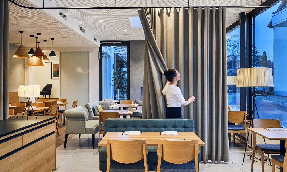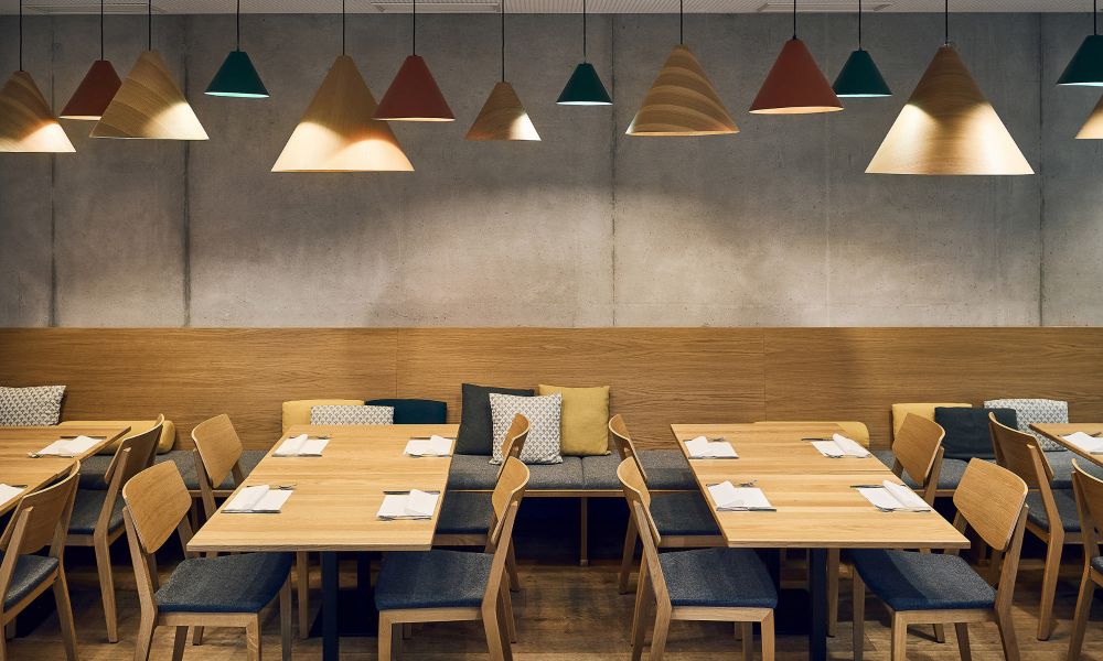 Ausstattungsplanung und Farbkonzept, Lieferung der kompletten Möblierung inklusive dekorativer Beleuchtung, sowie Theken (Frühstücksbuffet und Ausschank im Gastraum)
