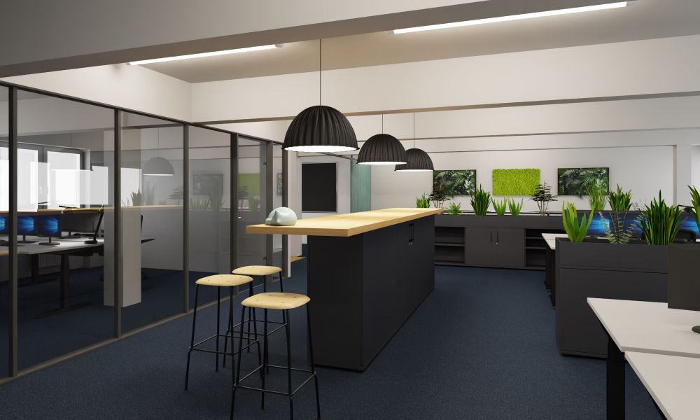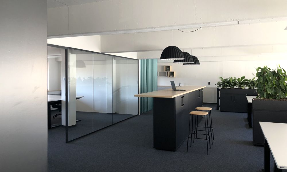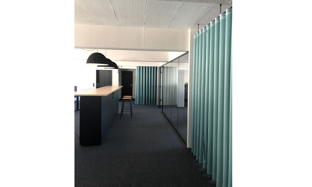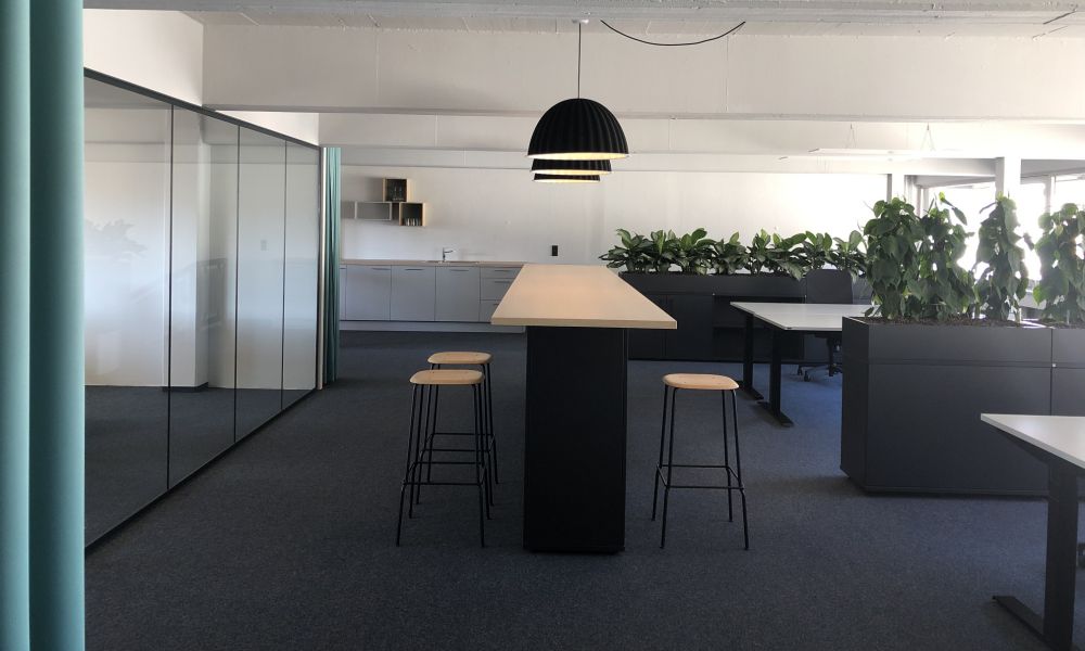 Planungskonzept für gesamte Bürofläche, Lieferung der kompletten Möblierung inklusive Beleuchtung