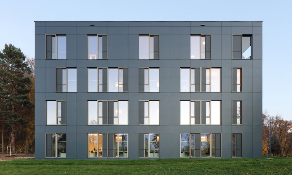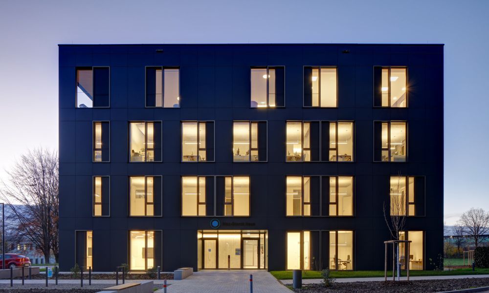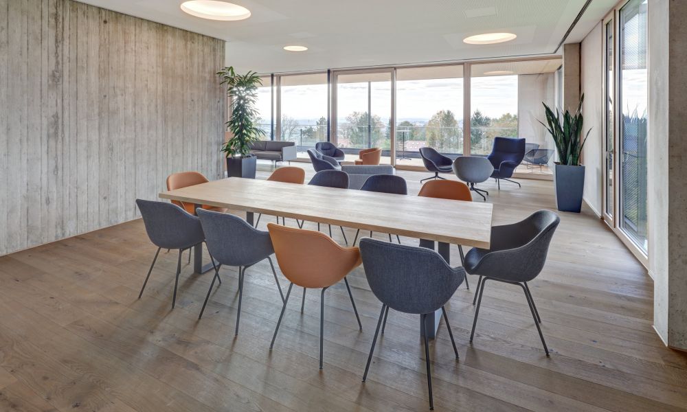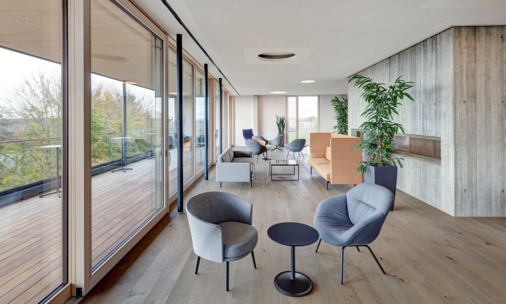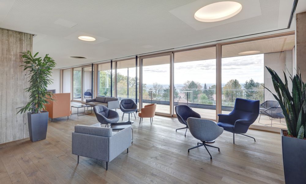 Das prägnanteste Detail: vom im Obergeschoss liegenden Konferenz- und Aufenthaltsbereich des Stiftungsvorstands aus schweift der Blick weit über den Uni Campus und die Stadt Ulm – und steht so auch für den Blick Richtung Zukunft, den Forschende in ihrer täglichen Arbeit leben.