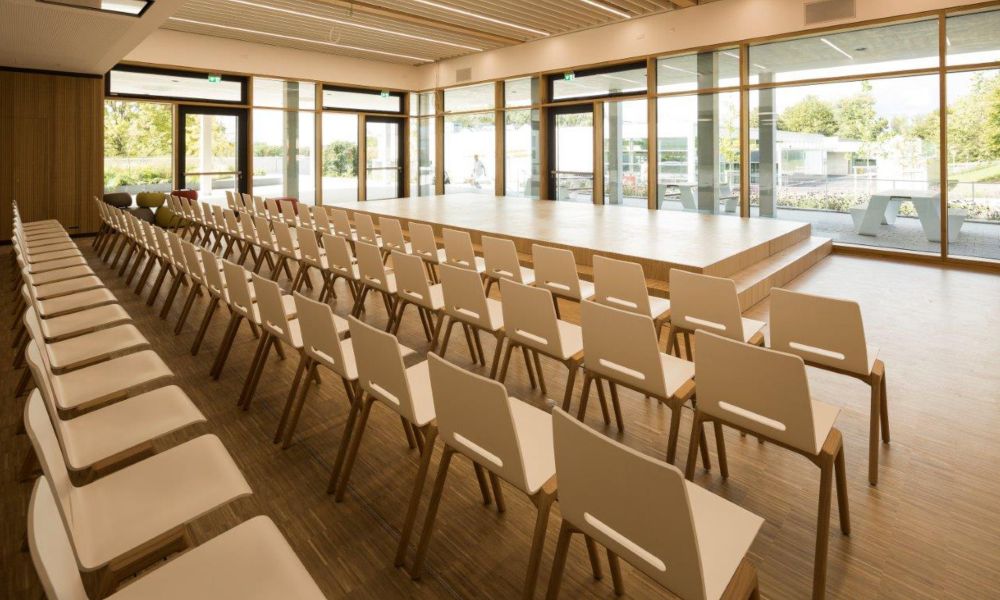 Auf der leicht erhöhten Bühne spielt sich zudem das kulturelle Schulleben ab. So richtig verwaist ist die Mensa also höchstens während der Ferien.