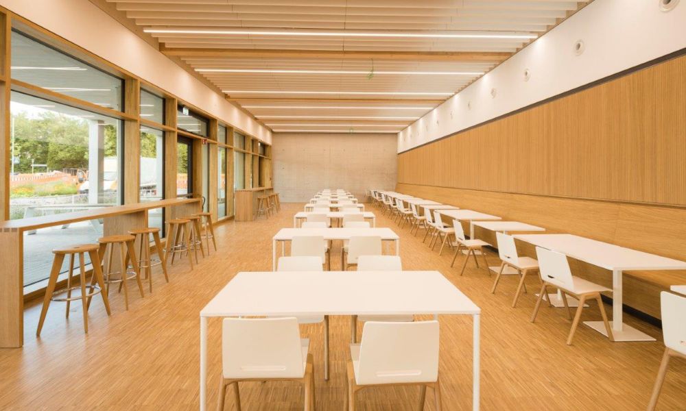 Durch die Wahl des zeitlosen Mobiliars passend zu den wohnlich wirkenden Festeinbauten aus Holz wirkt die Mensa warm und einladend – und das, ohne wild auf der Farbklaviatur zu spielen.