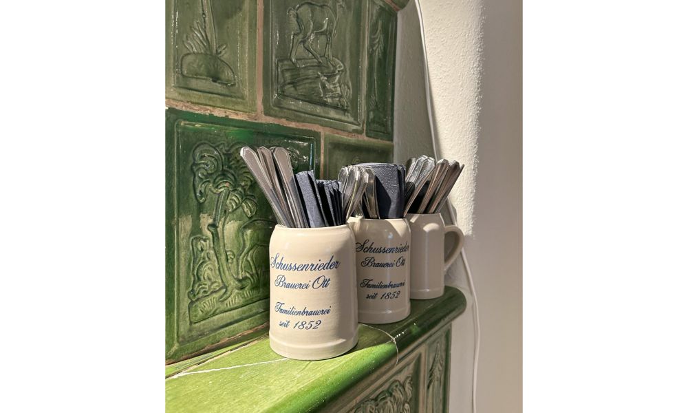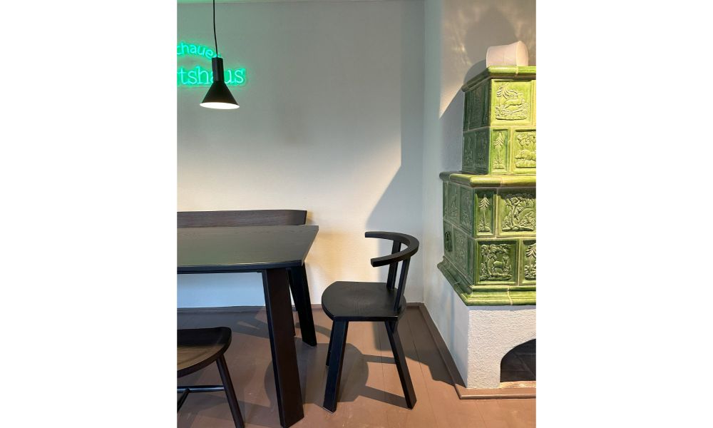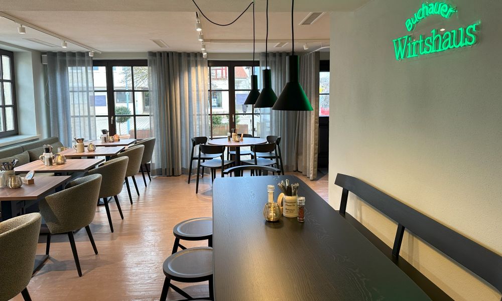 Um die Ecke dieses traumhaften Naturkleinods befindet sich das revitalisierte Buchauer Wirtshaus. Beim Betreten gut zu erkennen am grünen, zentral im Raum befindlichen Kachelofen. Um diesen herum haben sich nun in zurückhaltenden Farben gemütliche Wirtshausmöbel eingefunden, die sich je nach Wunsch des Gastes von „gschwind“ ein Feierabendgetränk am Hochtisch einnehmen bis zur „hier bleib ich bis zum Schluss“ - Sofabank jedem Wunsch anpassen.