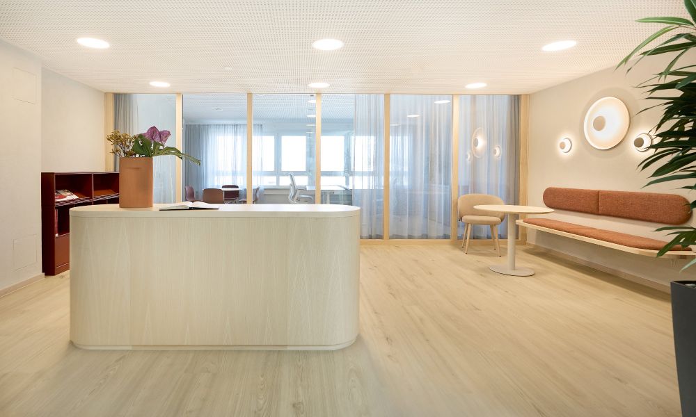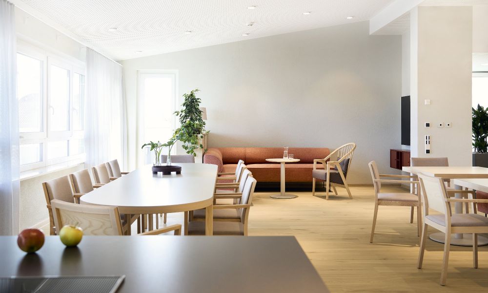Planungs- und Gestaltungskonzept für die gesamte Fläche. Lieferung der losen Möblierung für Gästezimmer, Aufenthalt & Gemeinschaftsräume, Pflegestützpunkt, Verwaltung. Einbaumöbel für Küche, Pflegestützpunkt, Empfang und Flurbereiche