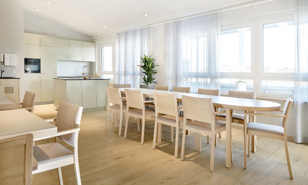 Die eigene Fotowand im Gästezimmer kann ebenso bestückt werden, wie das persönliche Bücherregal. Die Gemeinschaftsräume wie Wohn- und Esszimmer wirken trotz höchster Ansprüche an Eignung des Mobiliars im Palliativbereich nie klinisch oder kalt.