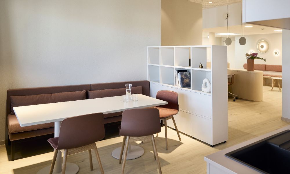 Ein gestalterisches Gesamtkonzept sorgt für ästhetische Ruhe und den roten Faden in Form von Farben, die sich durch die ganze Möblierung ziehen, unaufdringlich und Sicherheit vermittelnd.