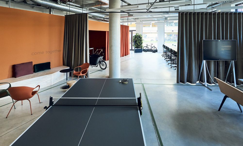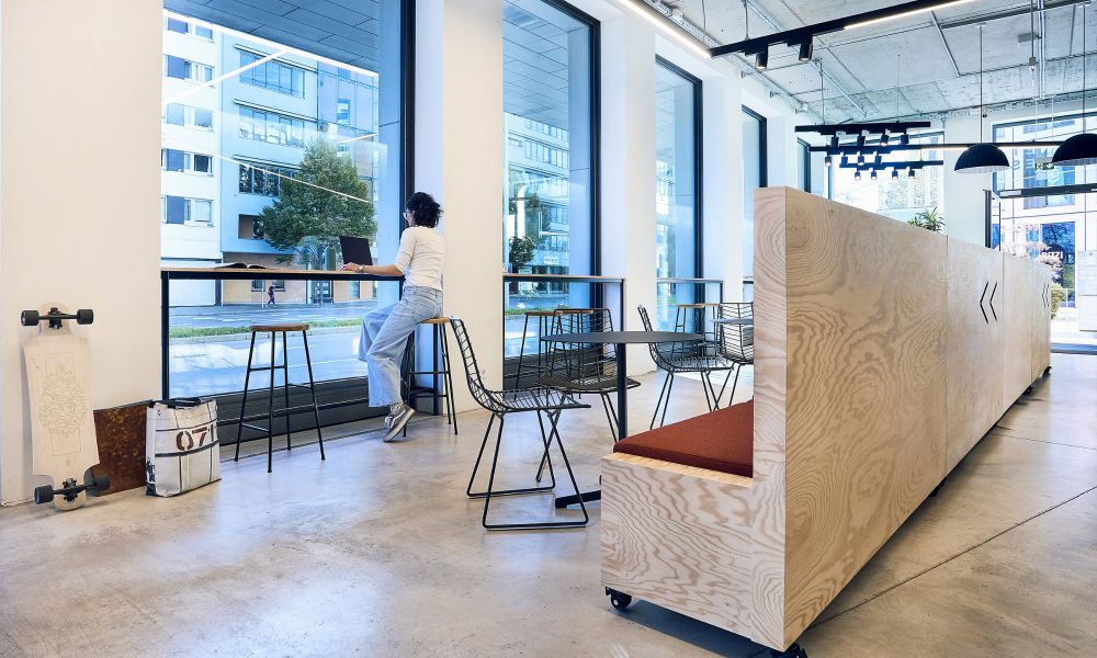... und das mitten in Stuttgart, an einem der größten Verkehrsknoten der Stadt. Auch wenn man es angesichts der vielen Autos kaum glauben mag: Hier findet mittelbar ein Teil der Verkehrswende statt, denn nur einen Steinwurf entfernt sitzt einer der führenden digitalen Fahrradfachhändler weltweit. Die MitarbeiterInnen sind naturgemäß outdooraffin und lieber draußen unterwegs, als in einem Bürogebäude zu sitzen. Unsere Aufgabe: Eine Raumwelt zu schaffen, die inspirierend für die Arbeit, gut für den Teamspirit und charaktervoll genug ist, um identitätsbildend für das ganze Unternehmen zu wirken. Am Standort arbeiten 260 Mitarbeiter. Ein Bienenvolk, bei dem die Königin das Fahrrad ist.