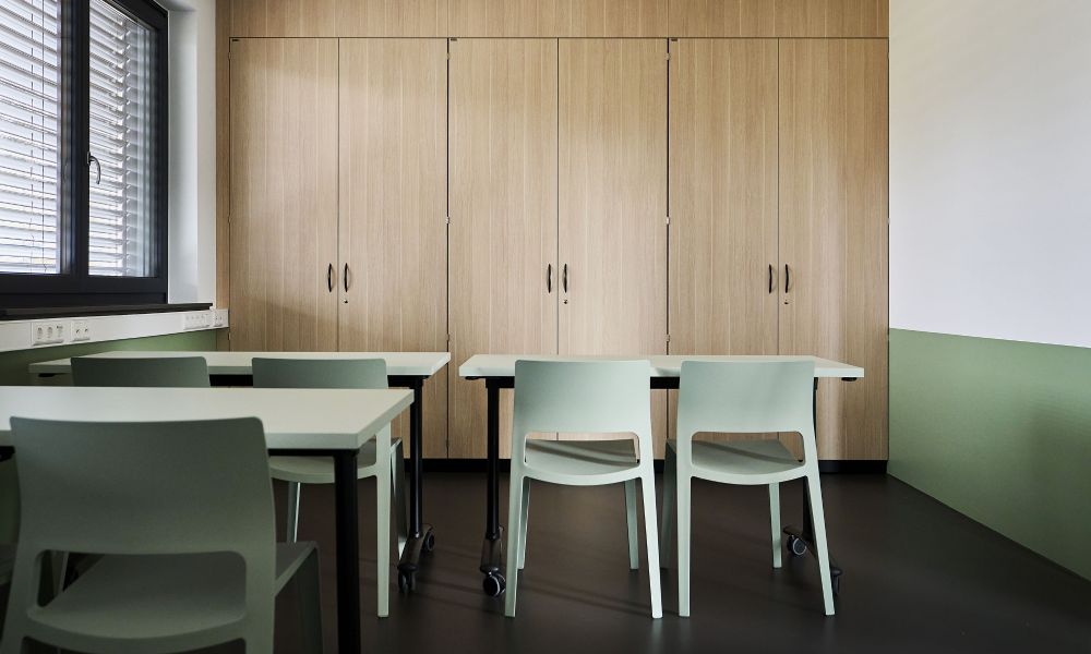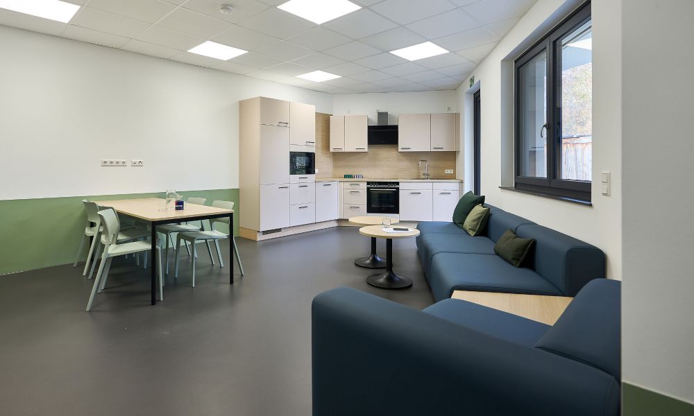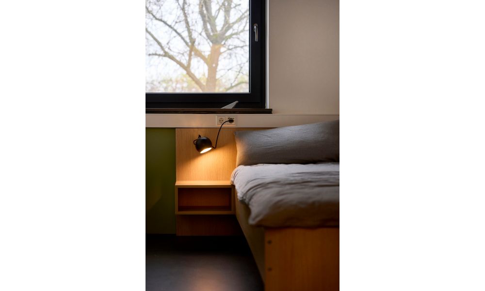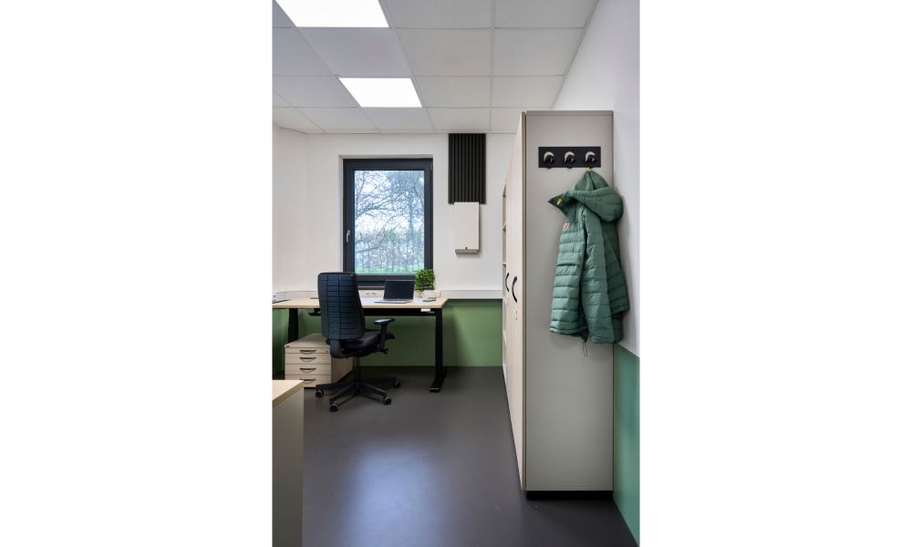 Dass man Arbeitsräume auch unter Berücksichtigung anspruchsvoller Hygiene- und Brandschutzanforderungen wohnlich gestalten kann beweist dieses Projekt eindrücklich, indem hier das klinische Ambiente, das medizinischen Einrichtungen zu oft inne wohnt, elegant vermieden wird. Freundliche, zarte Farben treffen hier auf Holz und schlichte Sichtbetonwände.
