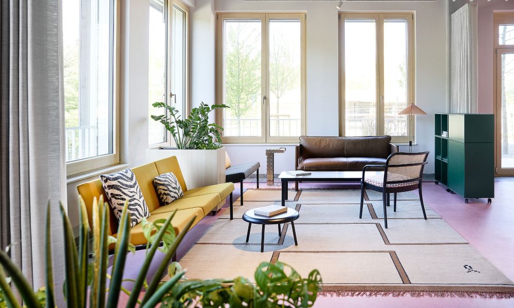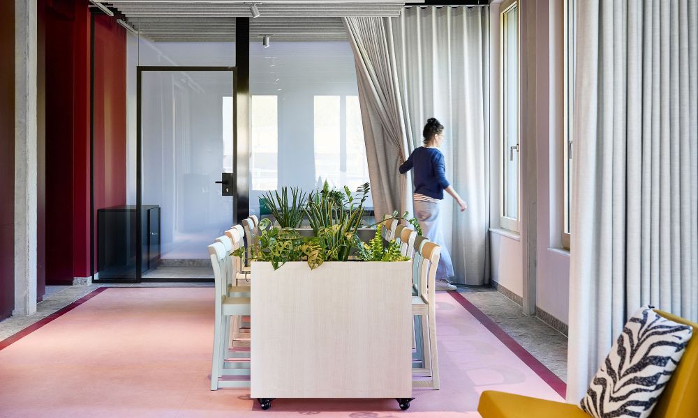 Ein warmes Willkommen stellt bereits der mobile und begrünte Empfangstresen dar, an dem es sich auch einfach mal so schön stehen lässt. Ist er bei Veranstaltungen im Weg, kann er einfach zur Seite gerollt werden.