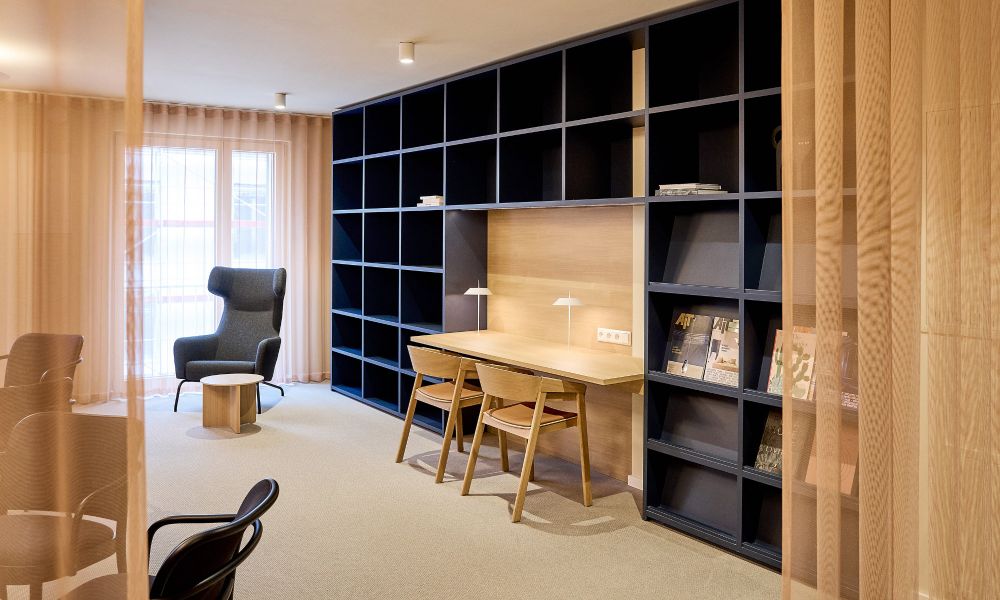 Wer sich im Alter wohntechnisch noch einmal neu orientiert, den schreckt mancherorts das Fehlen von Begegnungsräumen, die es ermöglichen, neue Kontakte und Netzwerke zu knüpfen. Sei es zum Kartenspielen oder das Feiern eines Geburtstags in größerer Runde. Nicht so in der Lumper Höhe. Seniorenbegegnungsräume wie die Bibliothek und eine Gemeinschaftsküche, die an das gute alte Großfamilienesszimmer erinnert, ergänzen das private Raumangebot und sind geschickt in der Mitte des Hauses A angeordnet, so dass der Weg zum nächsten Schwätzchen nie lange ist.