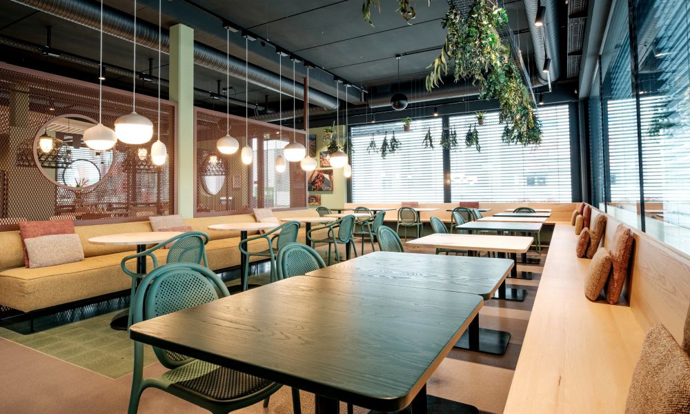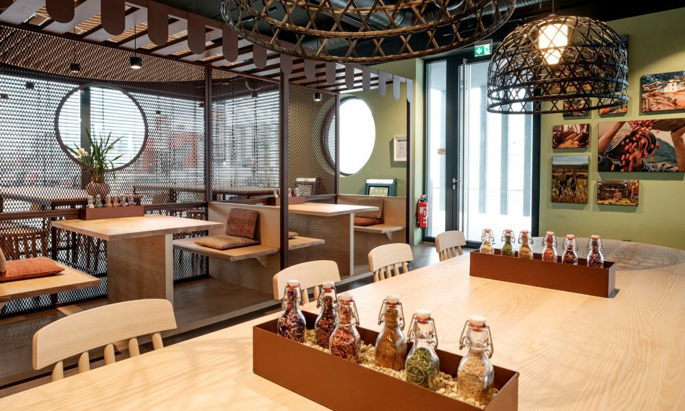 Entwicklung Einrichtungskonzept Gastraum, Thekenanlage, Material- und Farbkonzept, Lieferung der losen Möblierung, Festeinbauten und dekorativen Beleuchtung