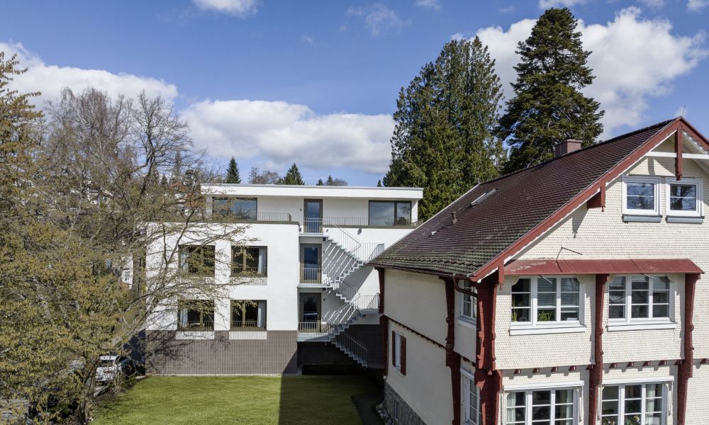 Das neu gebaute Marienhaus wurde eingebettet in einen parkähnlichen Garten inklusive eines Bestandsgebäudeensembles, das ästhetisch vor allem durch zwei alte Villen geprägt wird. Mit ihren holzgeschindelten Fassaden fühlen wir uns sofort an Thomas Manns Zauberberg-Sanatorium erinnert.