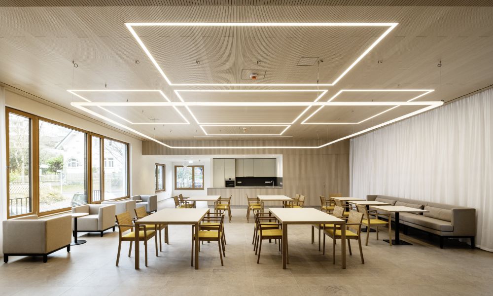 Im Marienhaus hingegen prägen die klaren Linien, der unverstellte Blick ins grüne Paradies des Gartens und die völlige Barrierefreiheit das Gebäude.